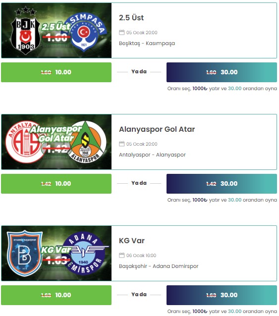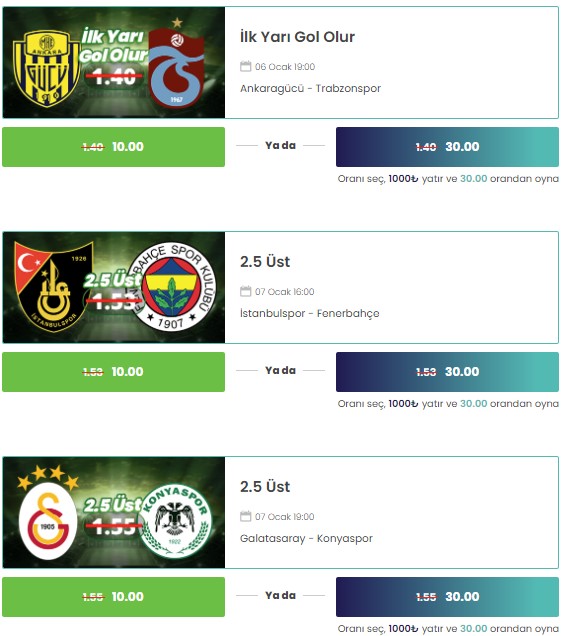 Ocak ayında ilk hafta sonunuzu neşelendirmek için daha fazla beklemeyin hemen aşağıdaki görsellerden ya da “30 ORAN İÇİN TIKLA” butonlarından herhangi birisine tıklayarak 30 oranlı maçlara bahis yap ve kazancını 30’a katla. İşte 30 oranlı bahisler;