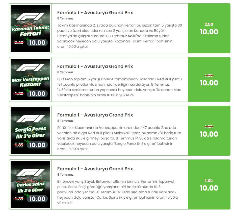 Bets10 sitesinde kazanmanın sınırı yok. Dünyanın dört bir yanında devam eden spor olayları Bets10 üyelerine 10 oran olarak geri dönüyor. Bu hafta Bets10 Formula 1 yarışlarında oranları 10’a yükseltti. Hemen Bets10 giriş adresine gel ve üyelik işlemlerini tamamla 5000TL bonusu al, haftanın 10’ları kampanyasıyla kuponunun kazancını 10’a katla.
