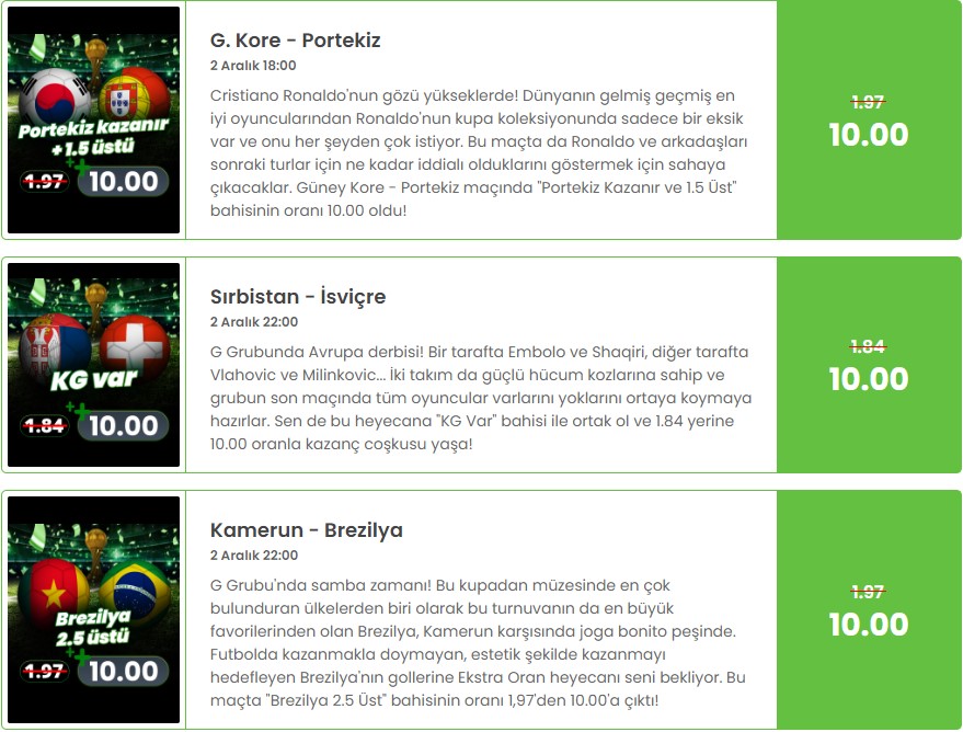 Bets10 bonus kampanyaları arasında 10-20 oranına yükseltilmiş kimi maçlar var. Lig zamanlarında büyük takımların maçlarına 10 oranla bahis imkanı veren Bets10 şirketi, Dünya Kupası turnuvası esnasında da bu özelliğini sürdürecek.