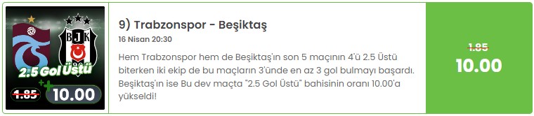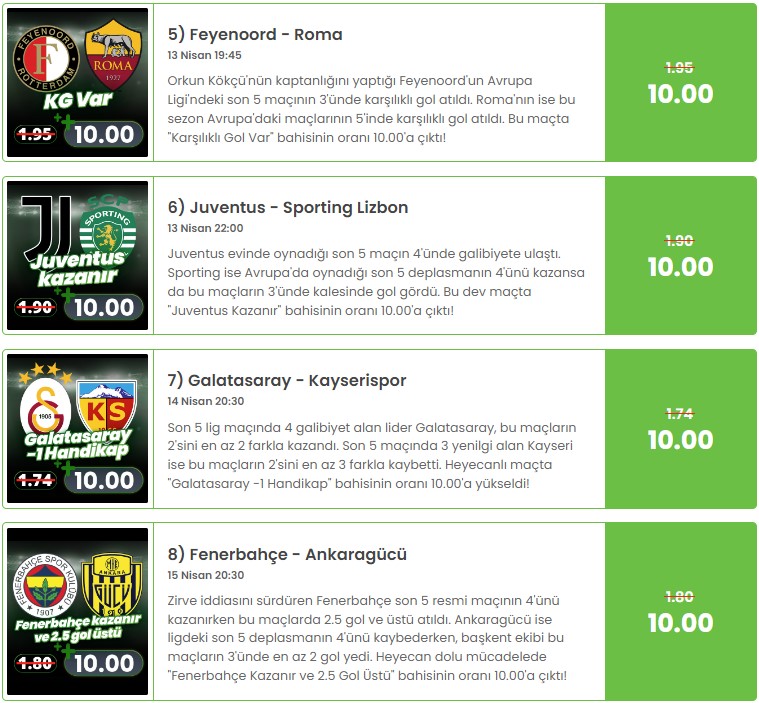 Bets10 bahis ve casino oyunları markası bahis sever üyelerine 10 katı kazandırmaya devam ediyor. Her hafta hatta her gün Bets10 haftanın 10’ları kampanyası özenle seçilen müsabakaların bahislerini 10’a çıkartıyor. Sen de kazananlar arasında yerini almak istiyorsan hemen Betson giriş yap ve üyelik işlemlerini tamamla, 5000TL hoş geldin bonusu kazan. İşte özenle seçilen ve 10 oran verilen maçlar;
